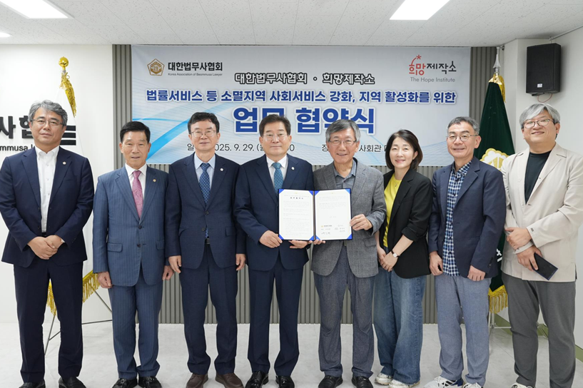 희망제작소 윤석인 이사장과 대한법무사협회 이강천 협회장을 비롯해 양 기관 관계자들은 법률 서비스 등 소멸지역 사회서비스를 강화하고 지역 활성화를 위한 업무협약(MoU)을 지난 9월 29일 맺었다.