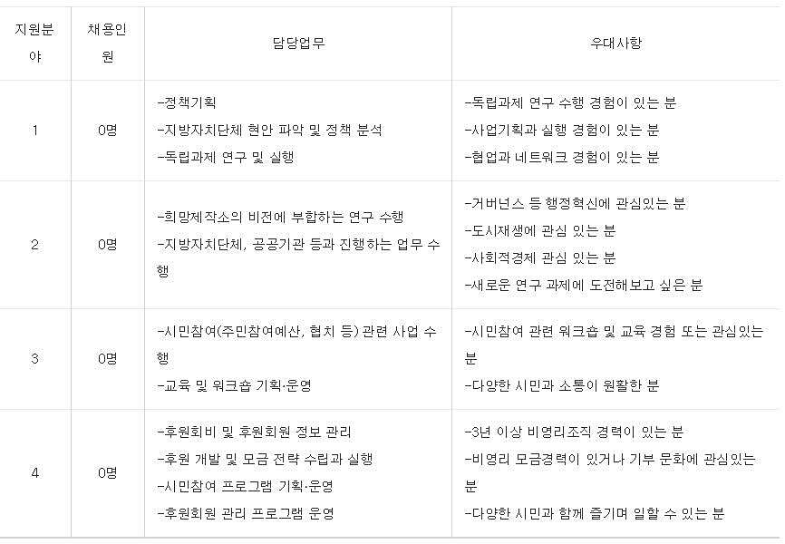 희망제작소는 시민의 참여를 통한 실사구시 정책과 다양한 사회혁신 방법론을 연구·실행하는 민간싱크탱크입니다. 희망제작소의 가치와 정신을 기반으로 꿈과 열정을 펼칠 새로운 연구원을 모십니다.