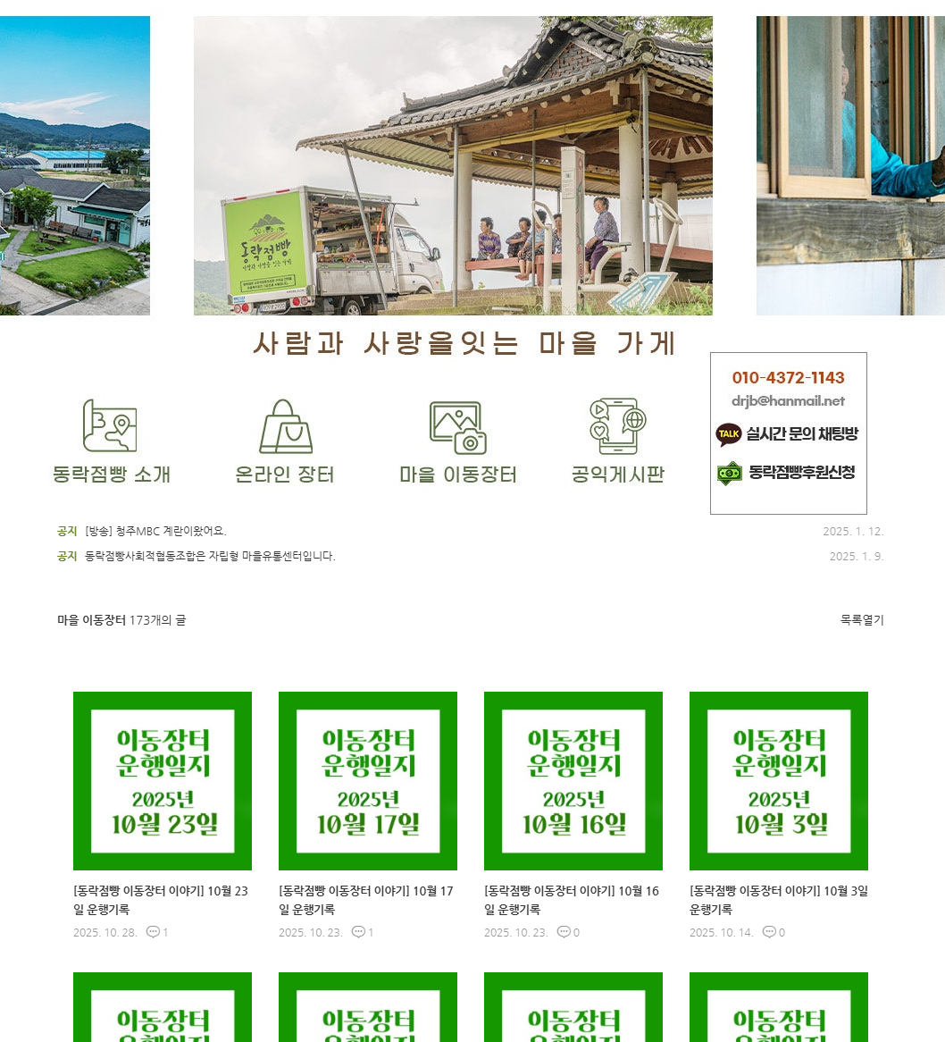 = 2010년 묘량면 유일한 작은 가게의 폐업이 계기가 되어 여민동락 공동체에서 마을가게 ‘동락점빵’을 설립했습니다. 이동장터 활동은 2011년 마을기업으로 시작해 2014년 마을 어르신 약 180여 명이 참여하는 사회적협동조합 창립으로 이어졌어요. 지금은 약 430여 명의 조합원이 함께 하고 있습니다. 기본적으로 매주 2회 마을을 순회하는 이동장터를 열고요. 학교, 노인대학, 마을회관에서 벌이는 마을행사나 공공급식 등에 필요한 재료와 물품을 공급하고 있습니다.