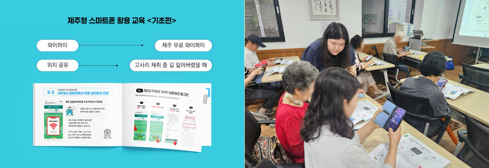 제주형 스마트폰 활용 교재 기초편 수업자료와 제주형 스마트폰 활용 교육 현장(사진 왼쪽부터) ⓒ터치제주